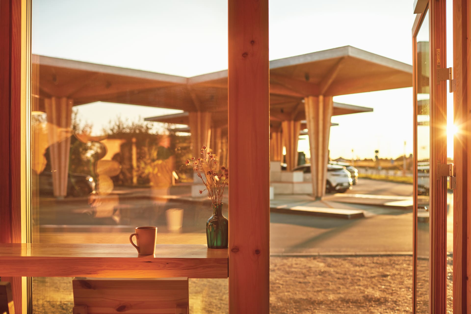 Her er neon og plastik bandlyst. I stedet finder du blomster og bæredygtigt træ. For i de grønne opladningsoaser er det meningen, at vores kunder tager en meningsfuld pause, mens de lader deres egne og bilens batterier til resten af turen.