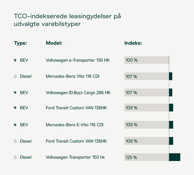 Indekset viser, at for eksempel en VW Transporter på diesel koster ca. 25 % mere i en fem-årig leasingperiode end en tilsvarende VW e-Transporter, der kører på el. Der findes altså flere eksempler på elvarebiler, der er billigere end deres dieselpartner.