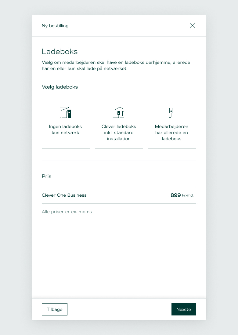 Nu er vi nået til, hvorvidt der skal installeres en ladeboks på medarbejderens privatadresse. Som noget nyt er der mulighed for at få rabat på standardinstallationen, hvis der allerede er installeret en ladeboks hjemme hos medbarjederen. Det kræver blot, at at installationen godkendes af Clevers installationspartner.