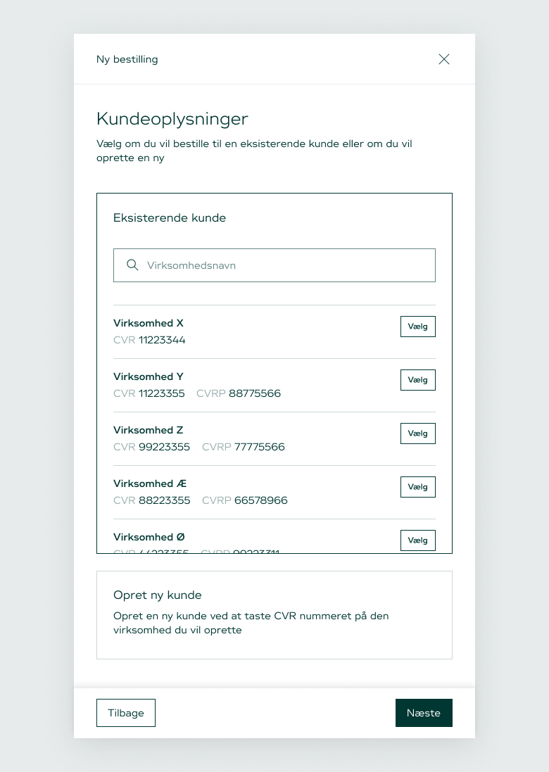 Du starter med at vælge den kunde, du skal bestille et nyt opladningsprodukt til. Du kan nemt vælge imellem eksisterende kunder eller oprette en ny.