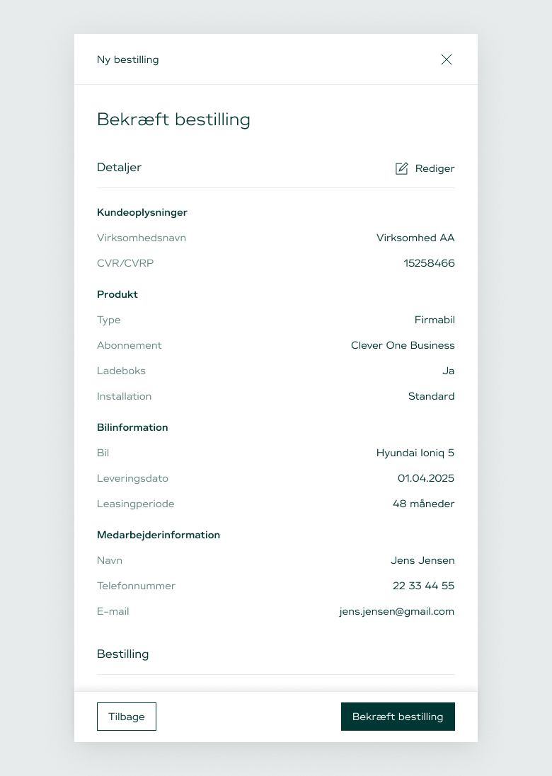 Til sidst får du en opsummering af bestillingen, så du har det fulde overblik, inden du færdiggør flowet ved at trykke på "Bekræft bestilling"