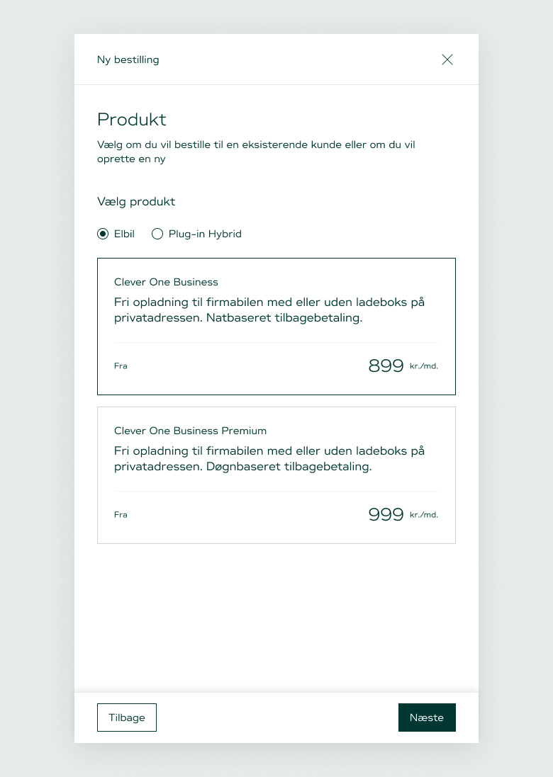 Nu skal du vælge hvilket opladningprodukt, kundens nye bil skal have tilknyttet. Da der er valgt firmabil i det foregående step, skal du her også vælge, om der er tale om en elbil eller en plug-in hybrid.