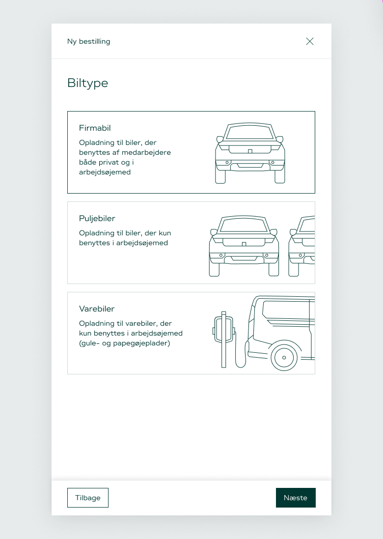 I dette step, skal du vælge hvilken bil, der skal bestilles opladning til. Du kan vælge imellem firmabil, puljebil eller varebil (bil indregistreret på gule- eller papegøjeplader). Det valg, du træffer her, påvirker hvilke produkter, du kan vælge imellem i efterfølgende step.