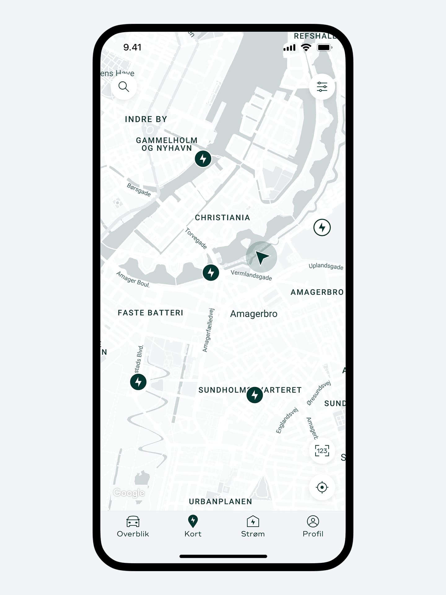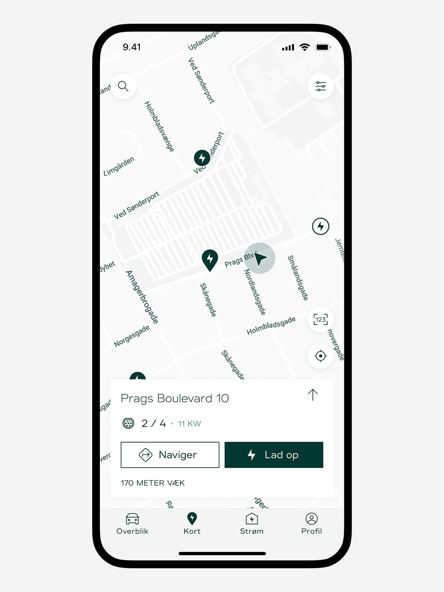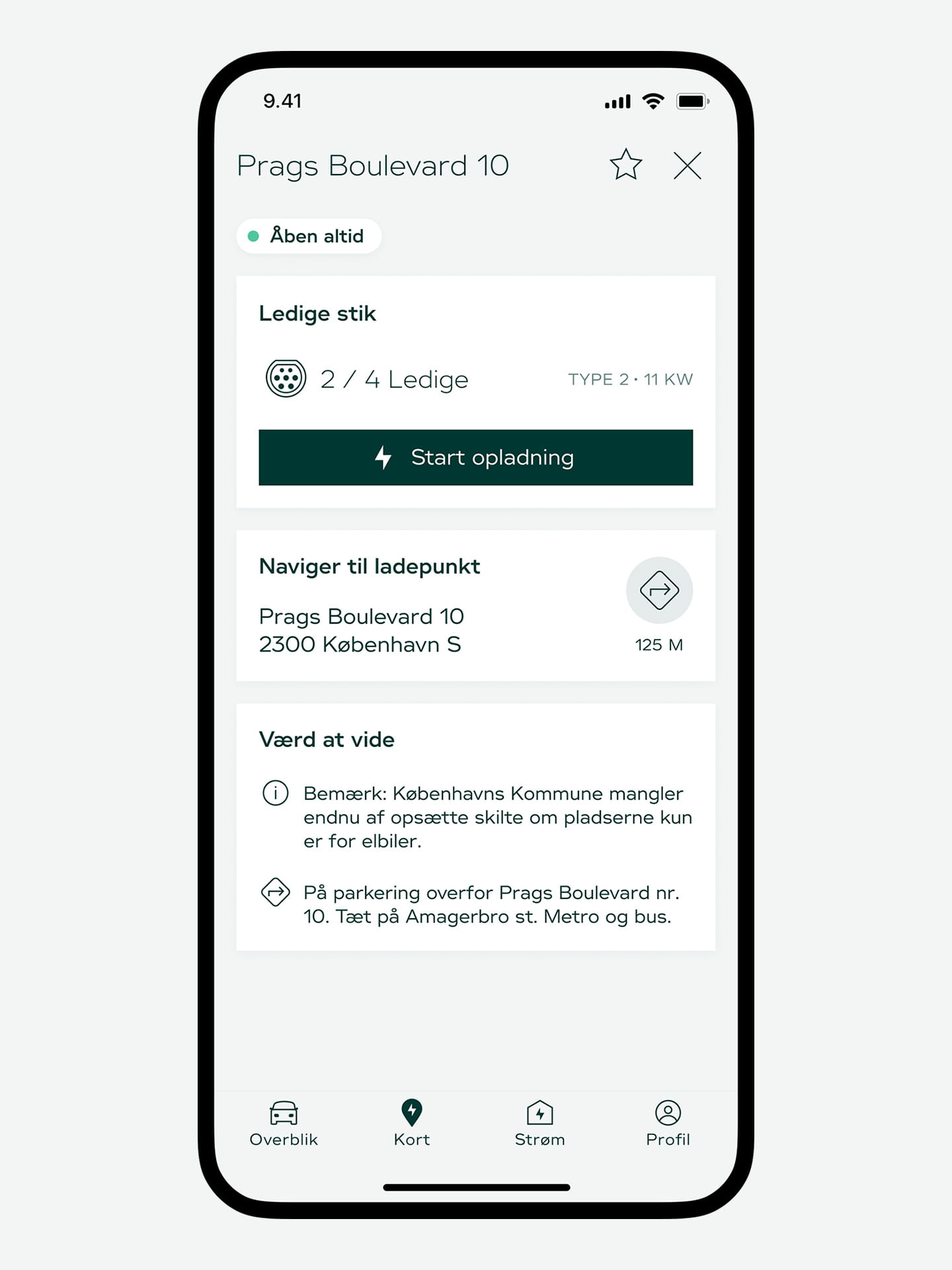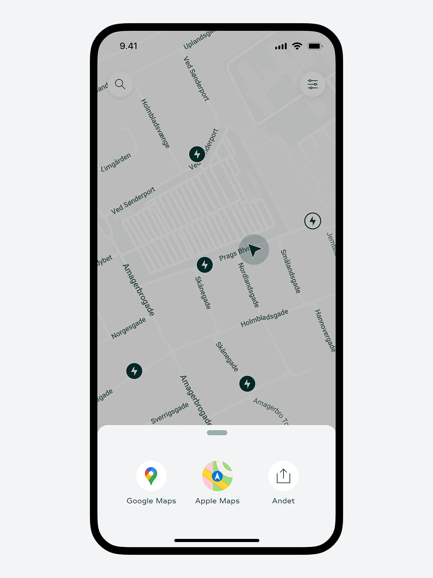 Når du har fundet et ladepunkt, kan du navigere til ladepunktet – så åbner du Google Maps, Apple Maps eller bilens egen navigationsapp, som viser dig vejen direkte til ladepunktet.