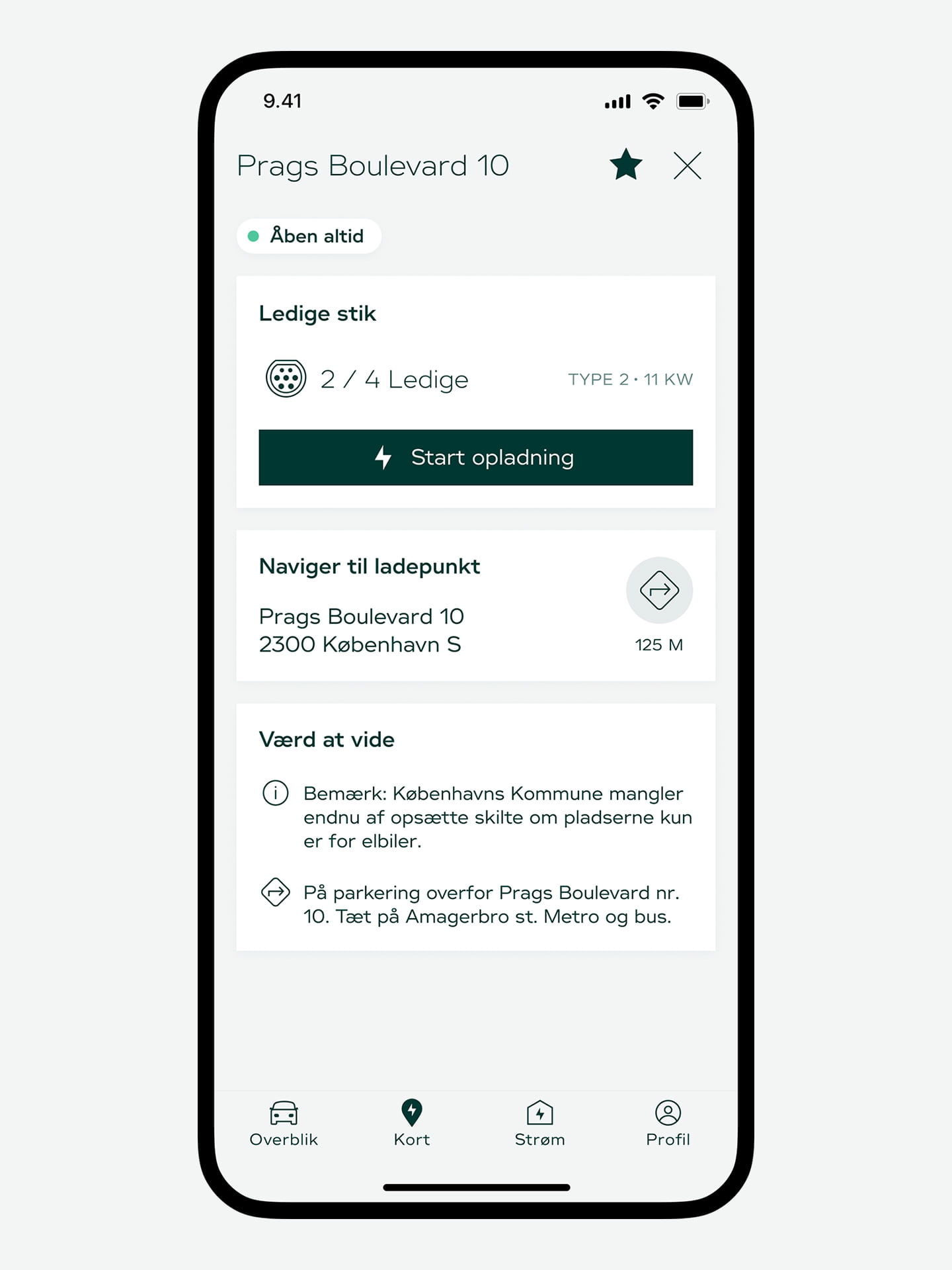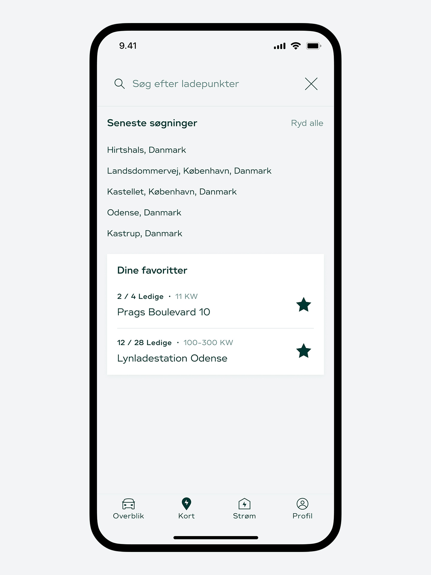 Bruger du et ladepunkt ofte, kan du tilføje det som favorit, så du nemmere kan finde det næste gang. Find ladepunktet på ladekortet, tryk på den lille stjerne. Nu ligger ladepunktet gemt under dine søgninger.