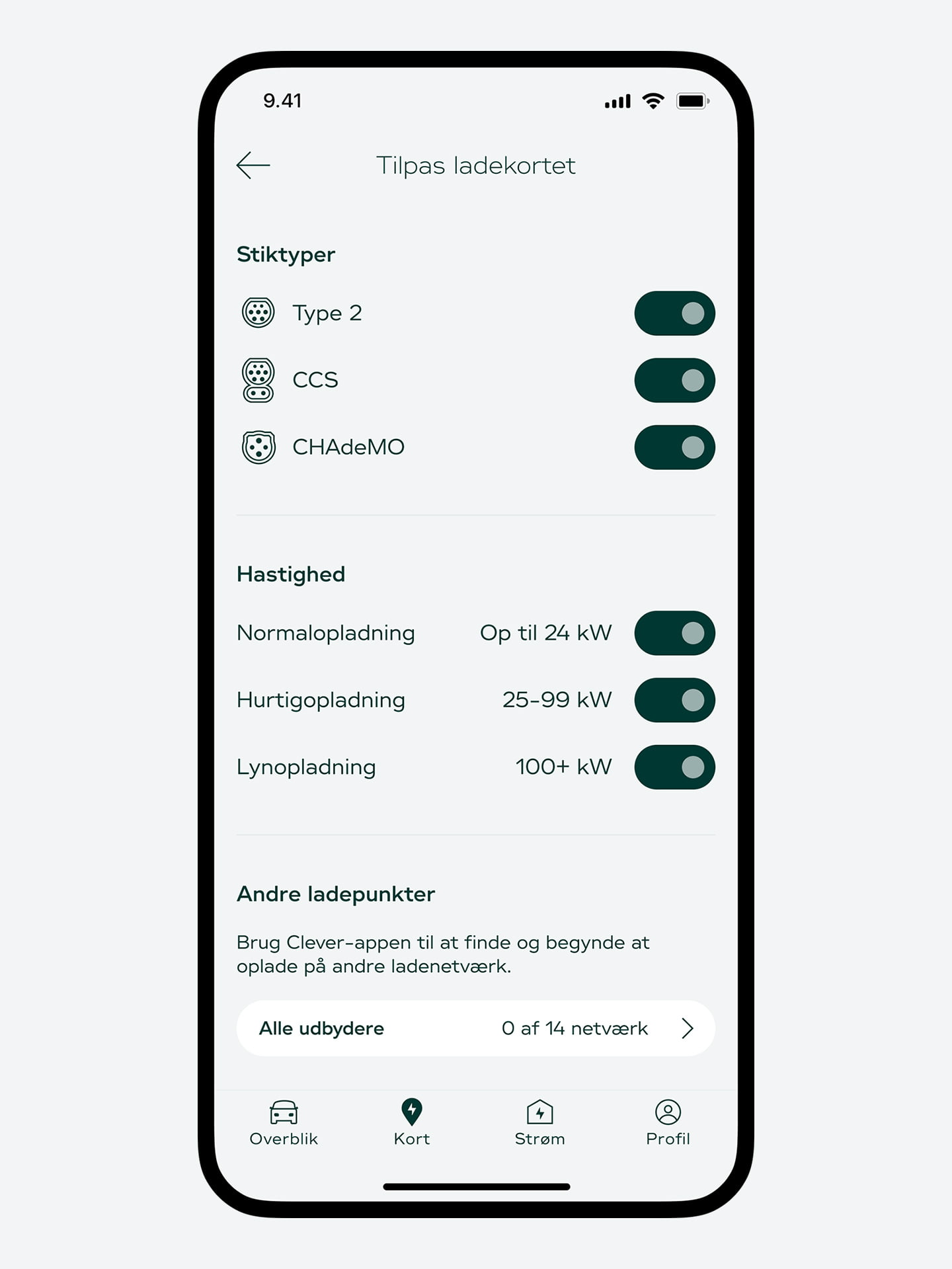 I Clevers app kan du finde et ladekort over Clevers ladenetværk. Så kan du hurtigt og nemt finde din næste opladning.