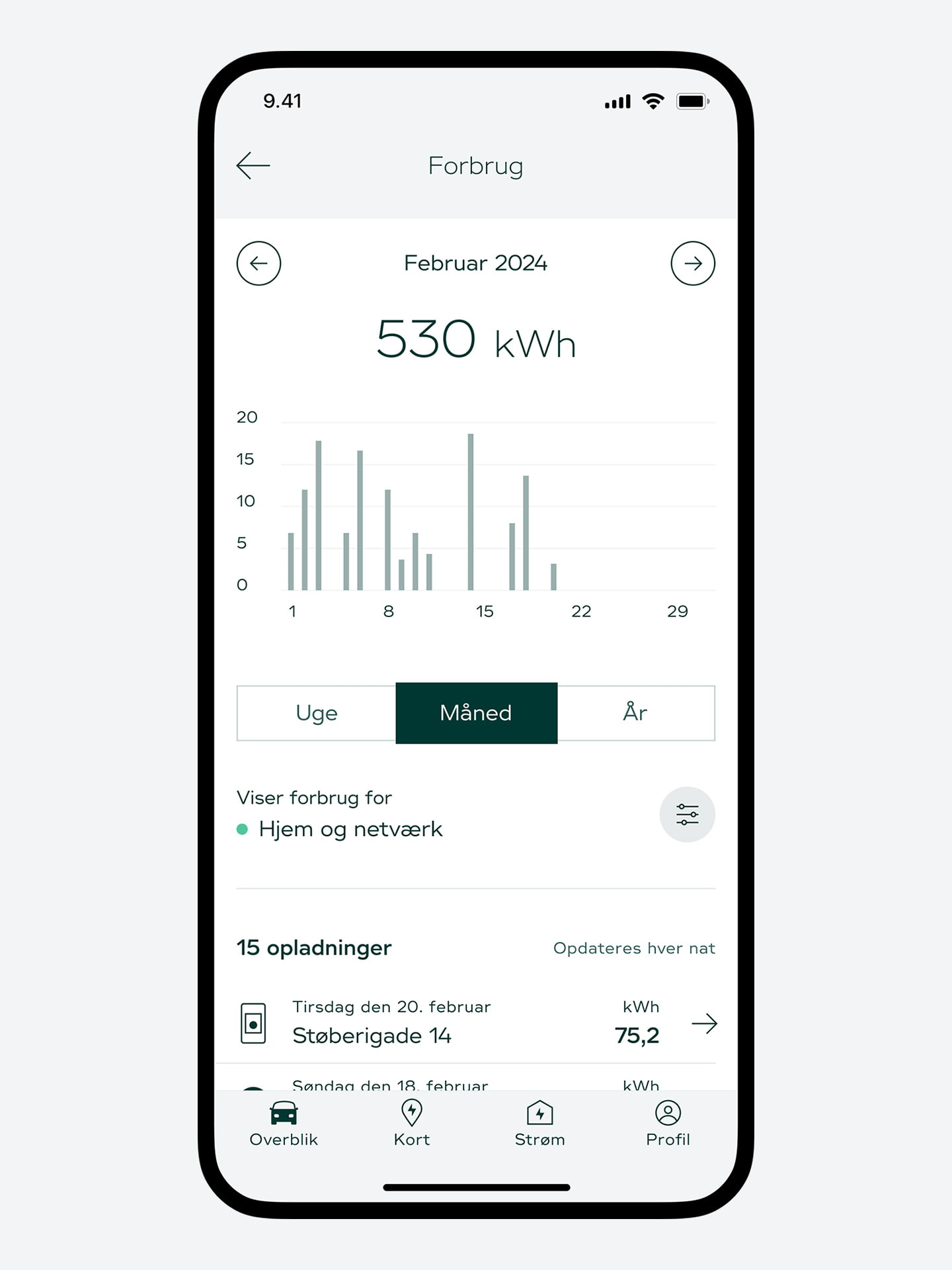 Du kan altid følge med i dit forbrug i Clevers app - både når du lader ude og hjemme.