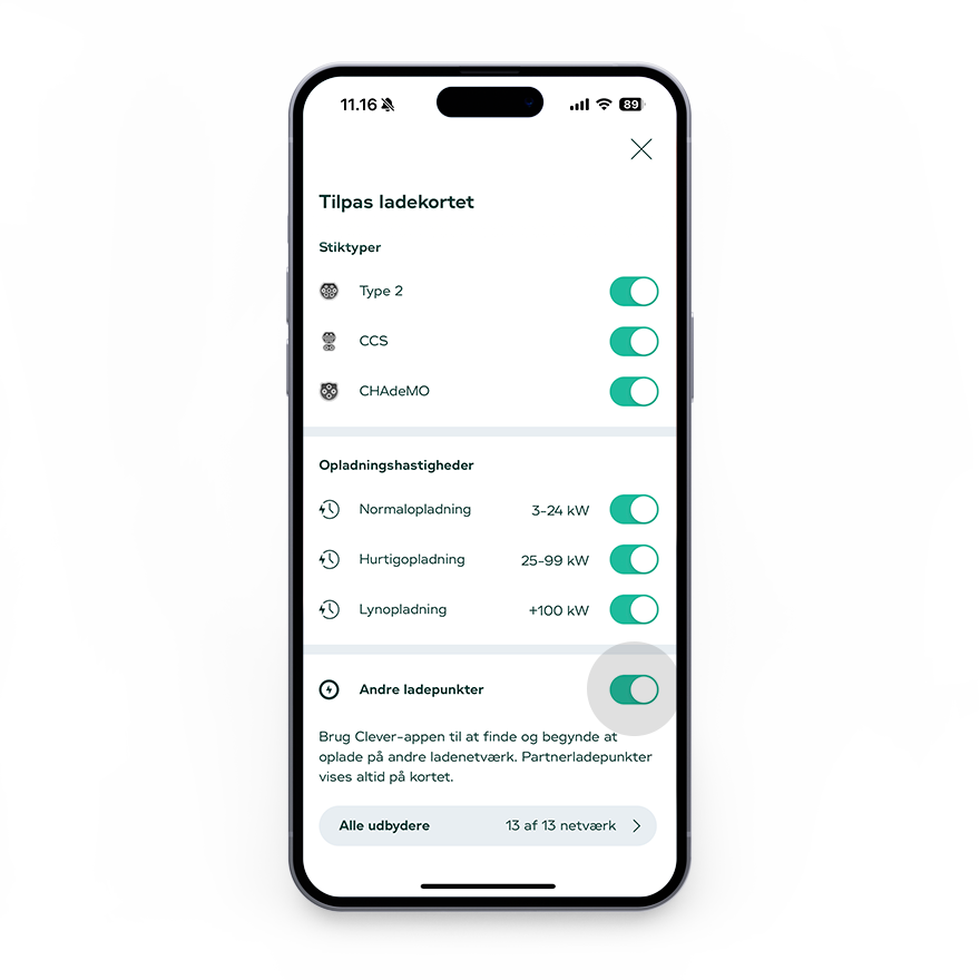Med Clever kan du lade på Danmarks største ladenetværk og nemt suse rundt og få strøm i hele landet på Clevers ladenetværk. Heldigvis kan du mere end det med Clever. Stærke samarbejder på tværs af Danmark og Europa gør det nemlig muligt også at lade hos tusindvis af andre ladeoperatører.