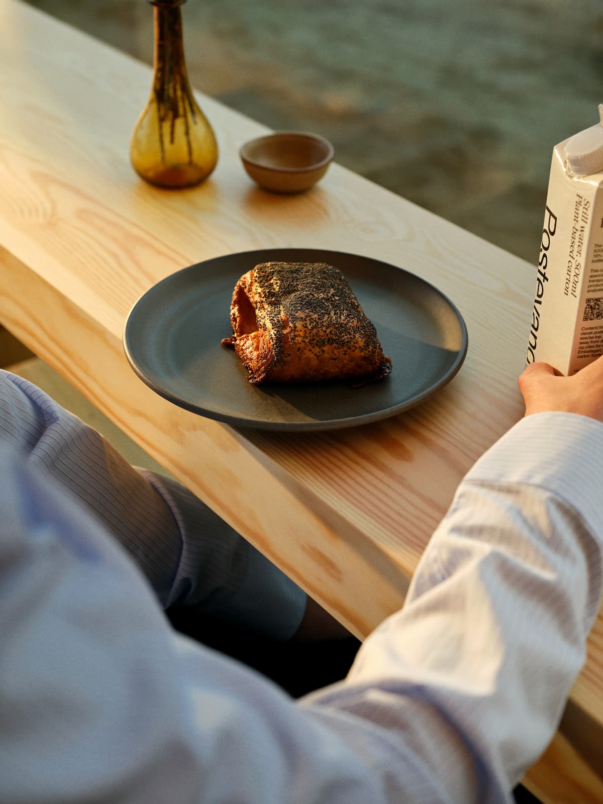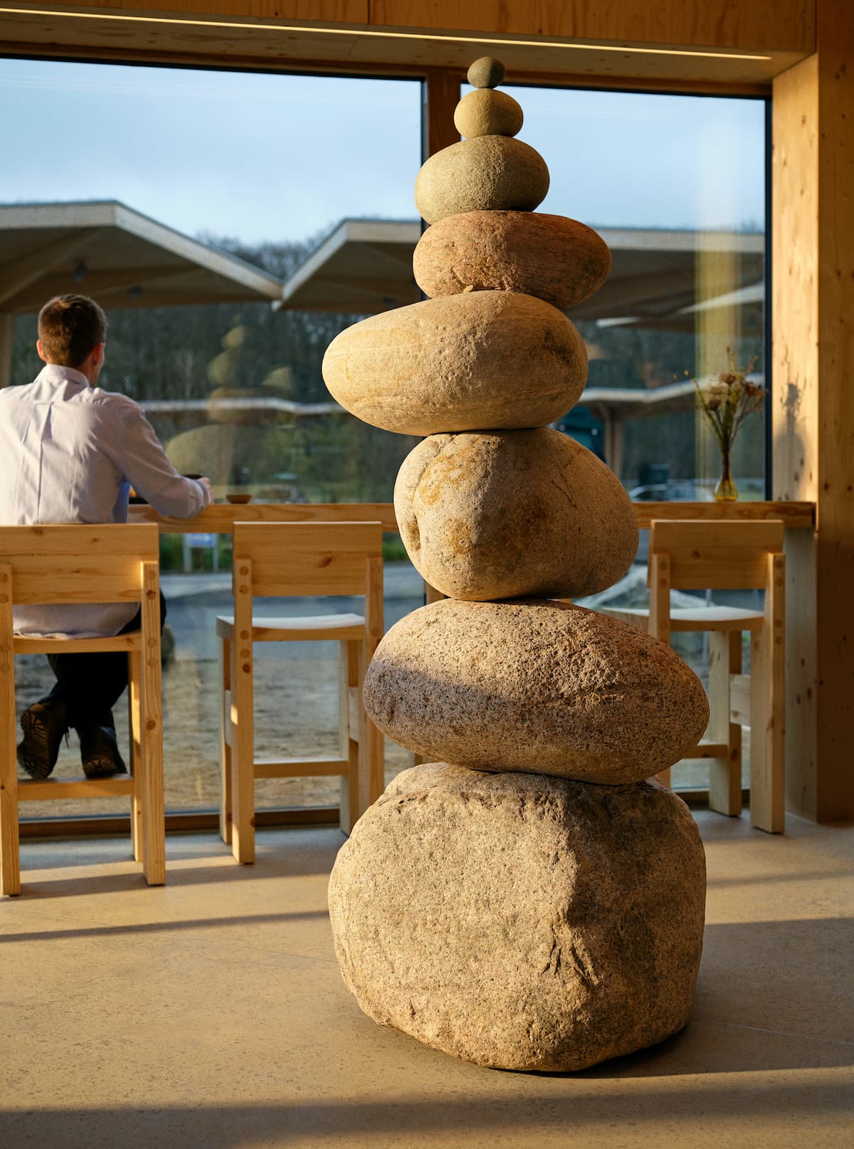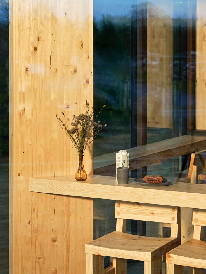 Caféen er tegnet af COBE og bygget i træ, glas og ærlige materialer. Et rum, der trækker naturen ind og motorvejslarmen ud. Her er ingen plastik og pangfarver – kun varme, ro og et sted at være.